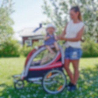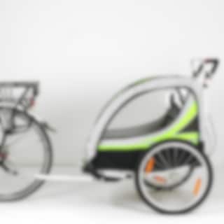 Lett sykkelvogn for ett eller to barn med stort lasterom. Praktisk barnevognsett med svingbart forhjul og barnevognhåndtak. Perfekt for deg som vil sykle til "byen" og deretter spasere fra butikk til butikk. Hyggelig kupé med plass til ett eller to barn. Rammen i aluminium gir lav vekt kombinert med en utmerket rustbeskyttelse. Nå med støtdempere for sidehjulene.