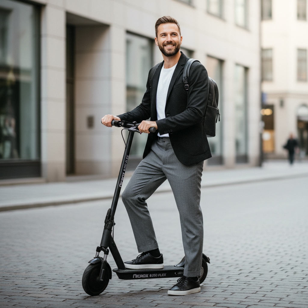 Nitrox S250 Flex drives av en kraftig 250W motor og tilbyr en toppfart på 20 km/t, perfekt for bymiljøer. Dens luftfylte dekk sikrer en myk kjøring selv på ujevne underlag, og med en rekkevidde på 25-30 km tar den deg enkelt dit du vil. Dessuten takler den bakker uten problemer, noe som gjør den ideell for variert terreng.