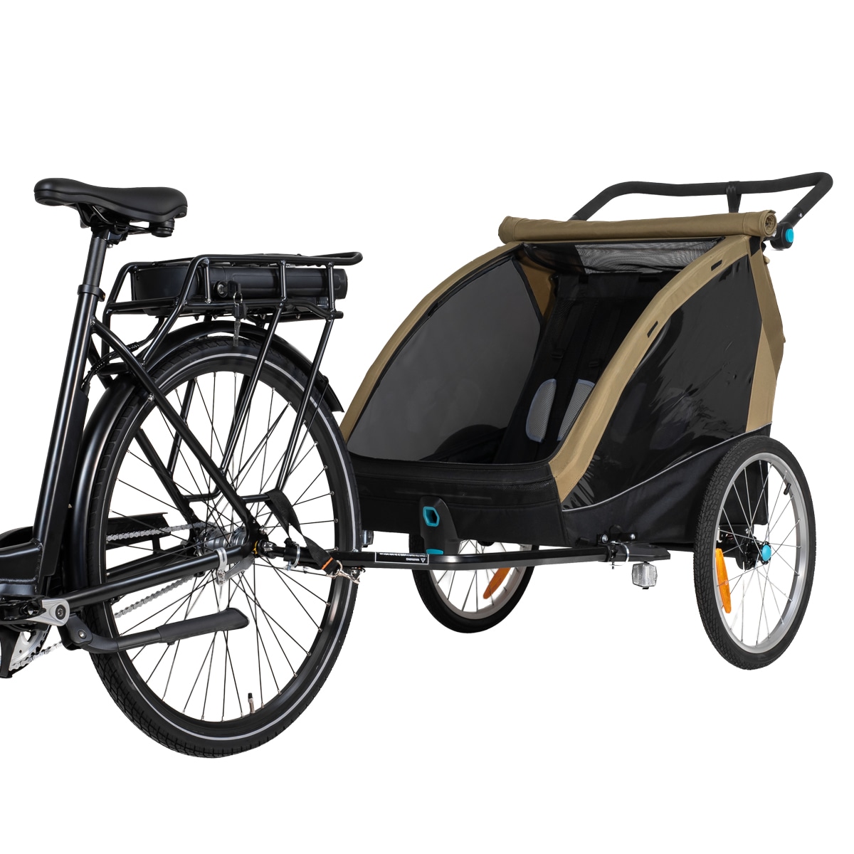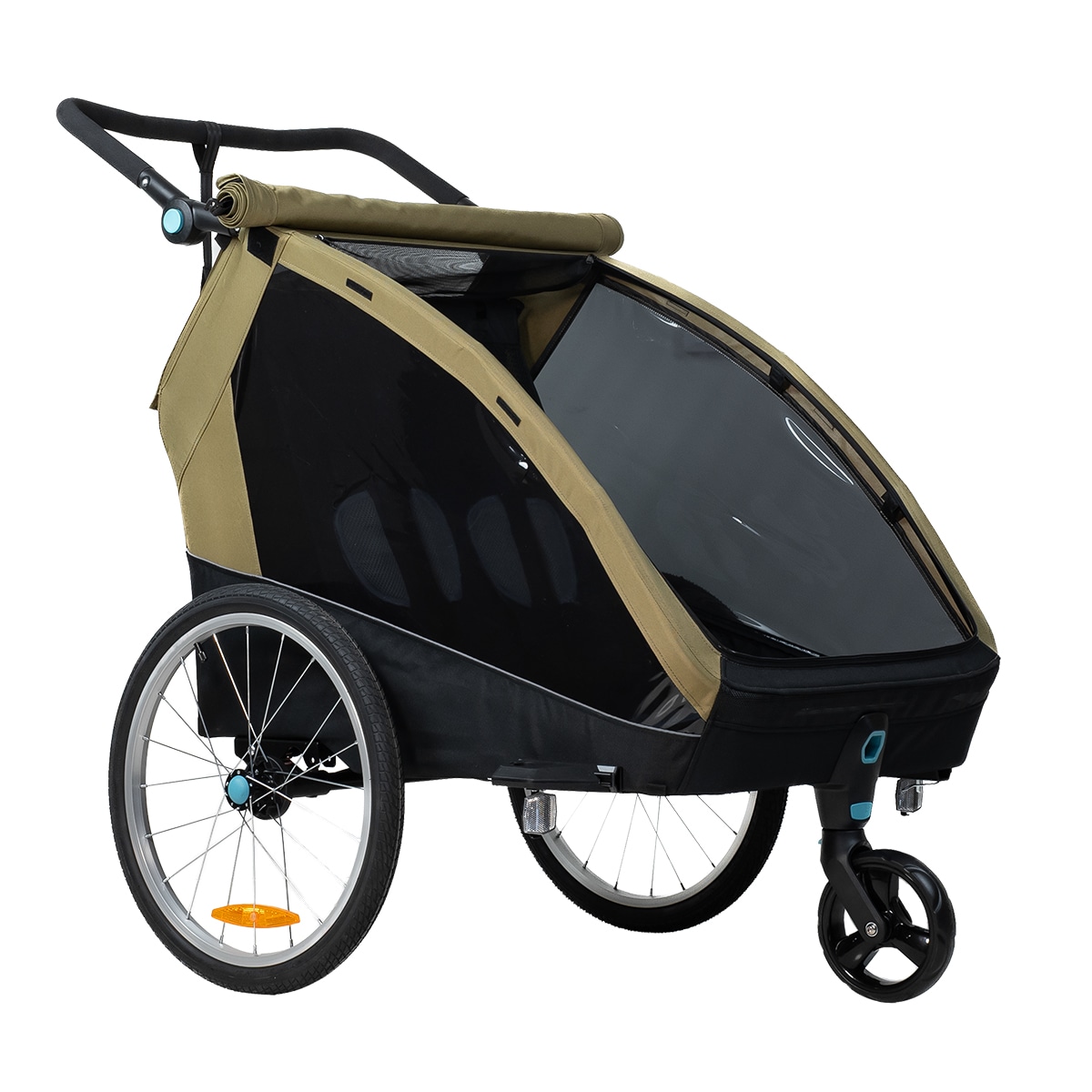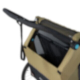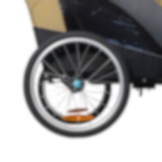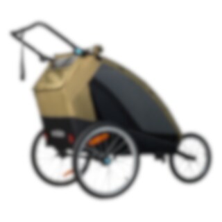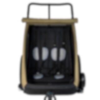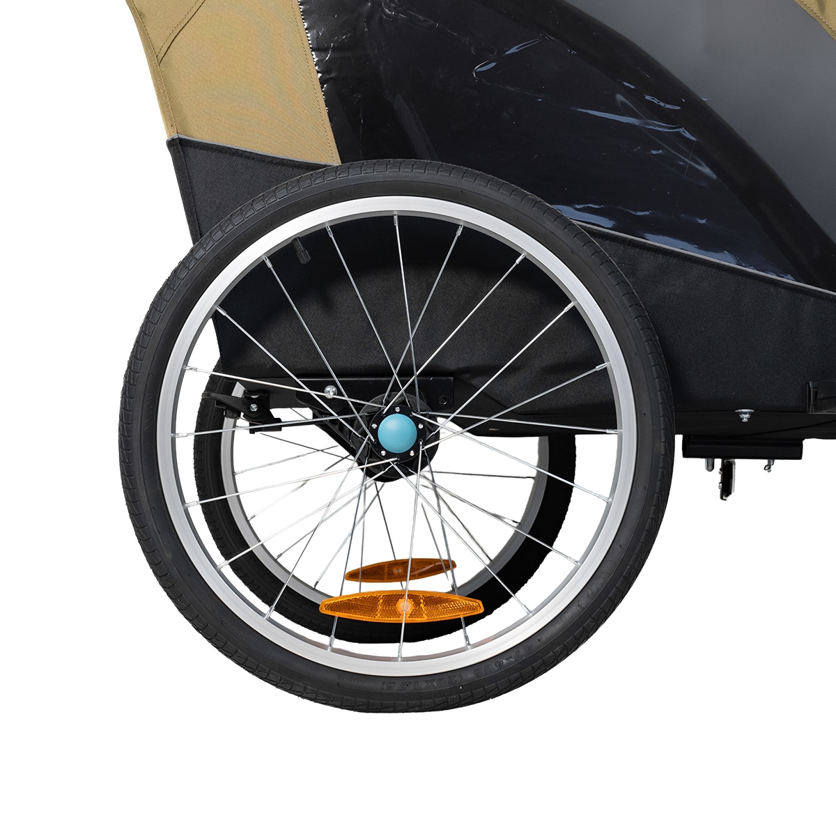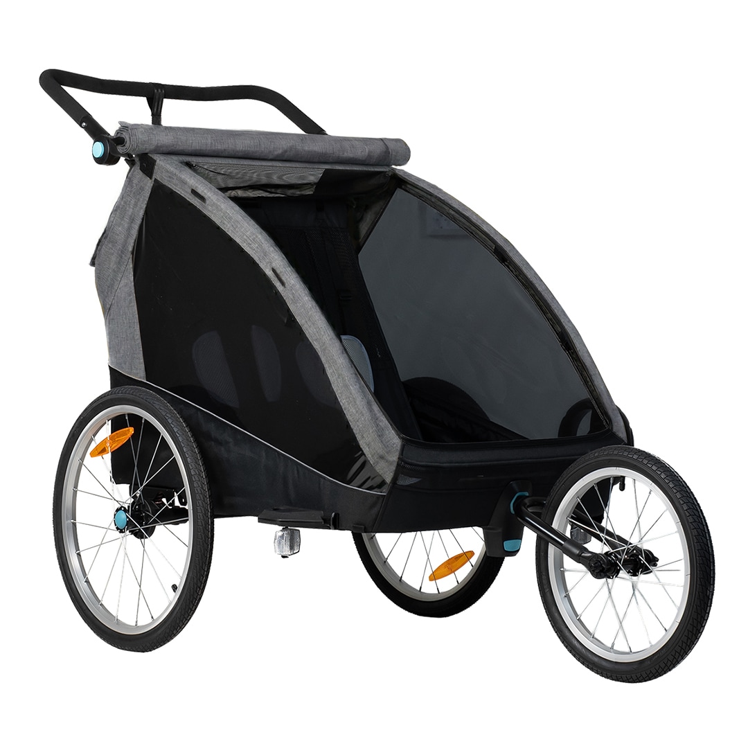 Sykkelvognen gir god plass til to barn og er laget i slitesterkt 600D Oxford-stoff med en vannsøyle på 5000 mm. Den tåler regn og daglig bruk, men sømmene er ikke teipet. Det følger med et integrert todelt vind- og solskjerm som enkelt kan brettes ut over åpningen. Vindskjermen er selvfølgelig vannavvisende dersom det kommer en regnskur. Den gjennomtenkte designen gir et beskyttet og komfortabelt sittemiljø underveis.