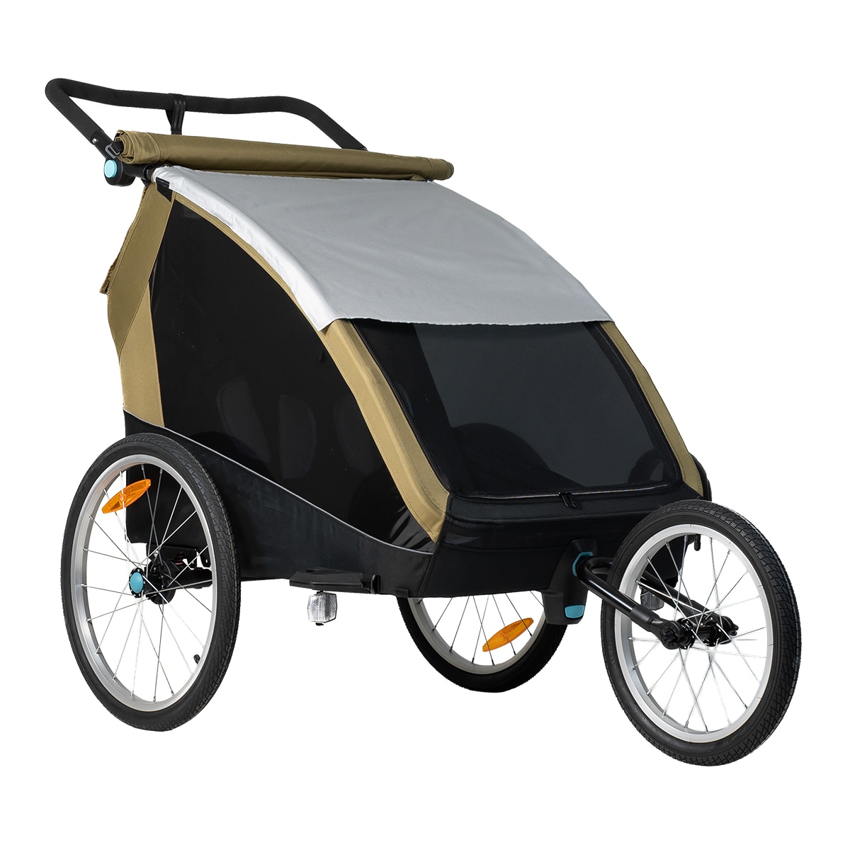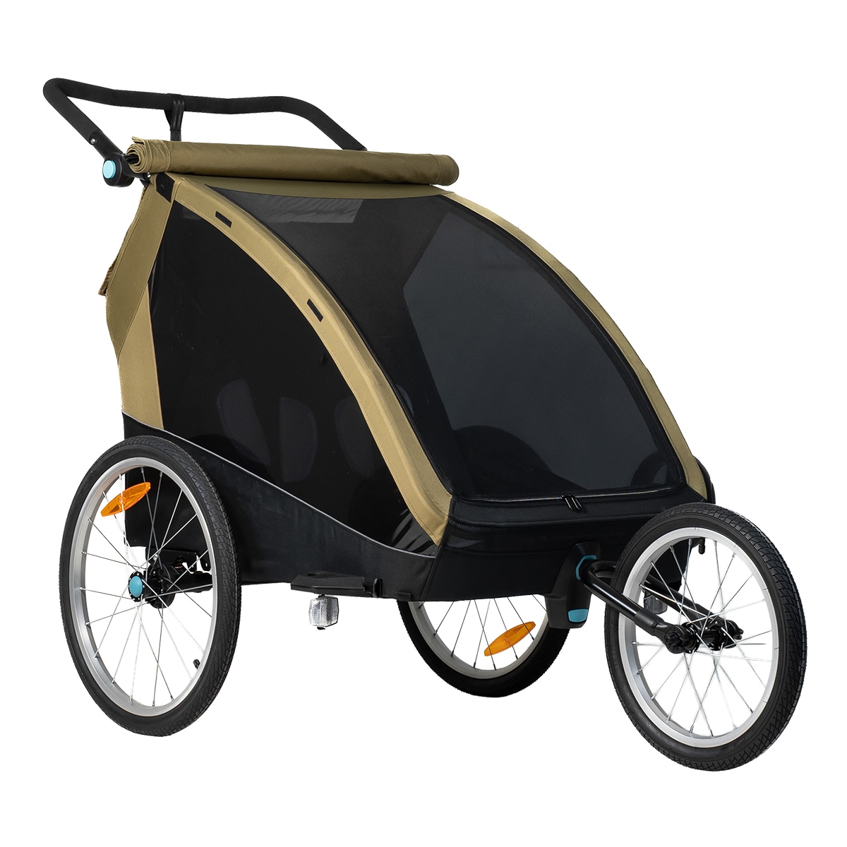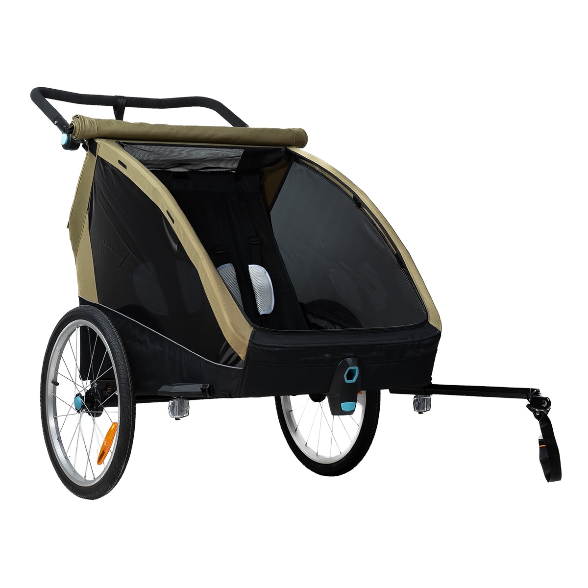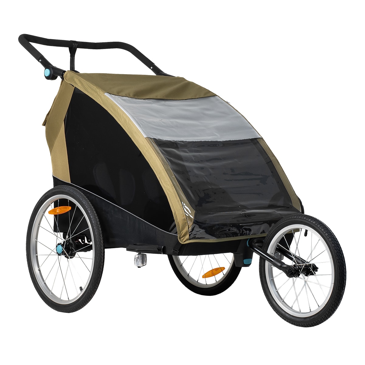 Sykkelvognen gir god plass til to barn og er laget i slitesterkt 600D Oxford-stoff med en vannsøyle på 5000 mm. Den tåler regn og daglig bruk, men sømmene er ikke teipet. Det følger med et integrert todelt vind- og solskjerm som enkelt kan brettes ut over åpningen. Vindskjermen er selvfølgelig vannavvisende dersom det kommer en regnskur. Den gjennomtenkte designen gir et beskyttet og komfortabelt sittemiljø underveis.